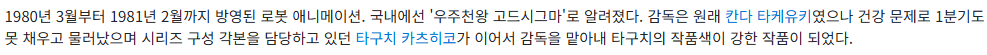 가시그마는 1980년 3월부터 1981년 2월까지 방영된 일본의 로봇 애니메이션으로, 국내에서는 1987년 12월 동양 비디오를 통해 소개되었습니다. 80년대 당시 흔치 않았던 미래와 현재를 오가며 벌어지는 사건들, 지구인이 무조건 선이 아니며 외계 세력 역시 악이 아닐 수 있다는 신선한 소재는 지금 다시 봐도 감명 깊은 부분이 많습니다. 충격적인 박사의 통수와 원래 적인 줄 알았던 테라가 비련의 여주인공으로 전면에 등장하면서 몰입감은 끊을 수 없는 아침드라마 수준까지 높아집니다. 80년대 로봇 애니메이션 특유의 상상력과 드라마성을 느끼기에 충분한 작품입니다.