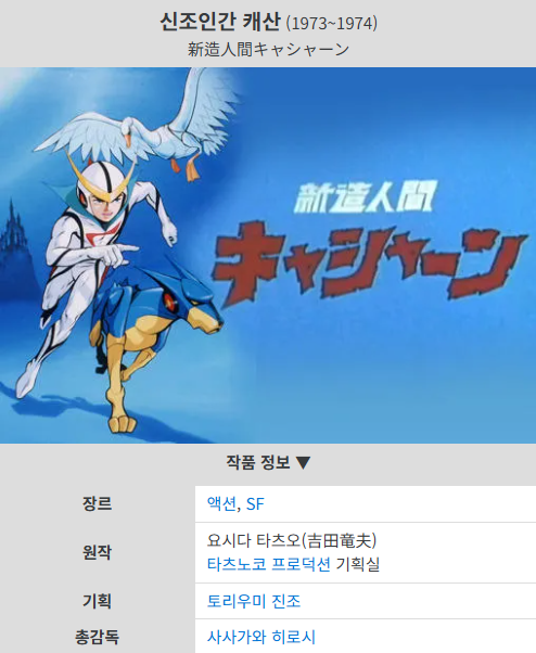 캐산은 국내에서 1978년부터 다음인 1979년까지 동양 방송을 통해 《정의의 캐산》이란 제목으로 처음 전파를 탔고, 그 후 비디오로도, 2000년대에는 완벽한 리메이크 작품으로도 많은 이들의 추억으로 지금까지 회자되는 명작입니다. 타츠노코 프로덕션은 《테카맨》, 《독수의 오형제》 등으로도 유명한 제작사로, 그들의 작품 세계는 항상 인간과 기술, 정의와 희생이라는 주제를 깊이 있게 다뤄왔습니다.