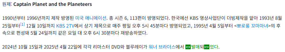 캡틴 플래닛은 1990년부터 1996년까지 총 6개 시즌 113편의 에피소드로 제작된 미국 DIC 엔터테인먼트의 작품입니다. 꼬꼬마 텔레토비, GI 유격대, 형사 가제트 등을 제작한 이 회사는 환경 보호라는 주제를 정면으로 다루는 과감한 기획을 선보였습니다. 국내에는 1993년 KBS를 통해 수입되어 매주 월요일부터 금요일 오후 5시 45분 황금 시간대에 방영되었고, 1995년 재방영되며 국민 애니메이션으로 자리잡았습니다.